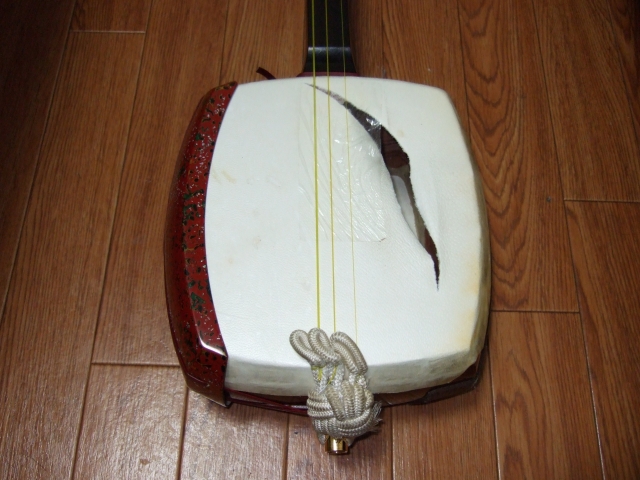 津軽三味線って、胴の部分には犬の皮がものすごいテンションで糊で張ってあってあるのです。